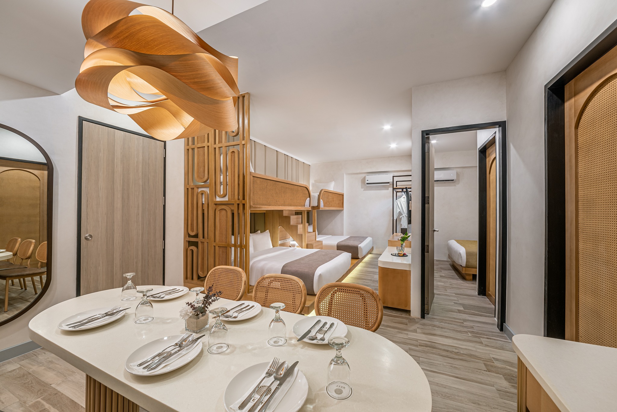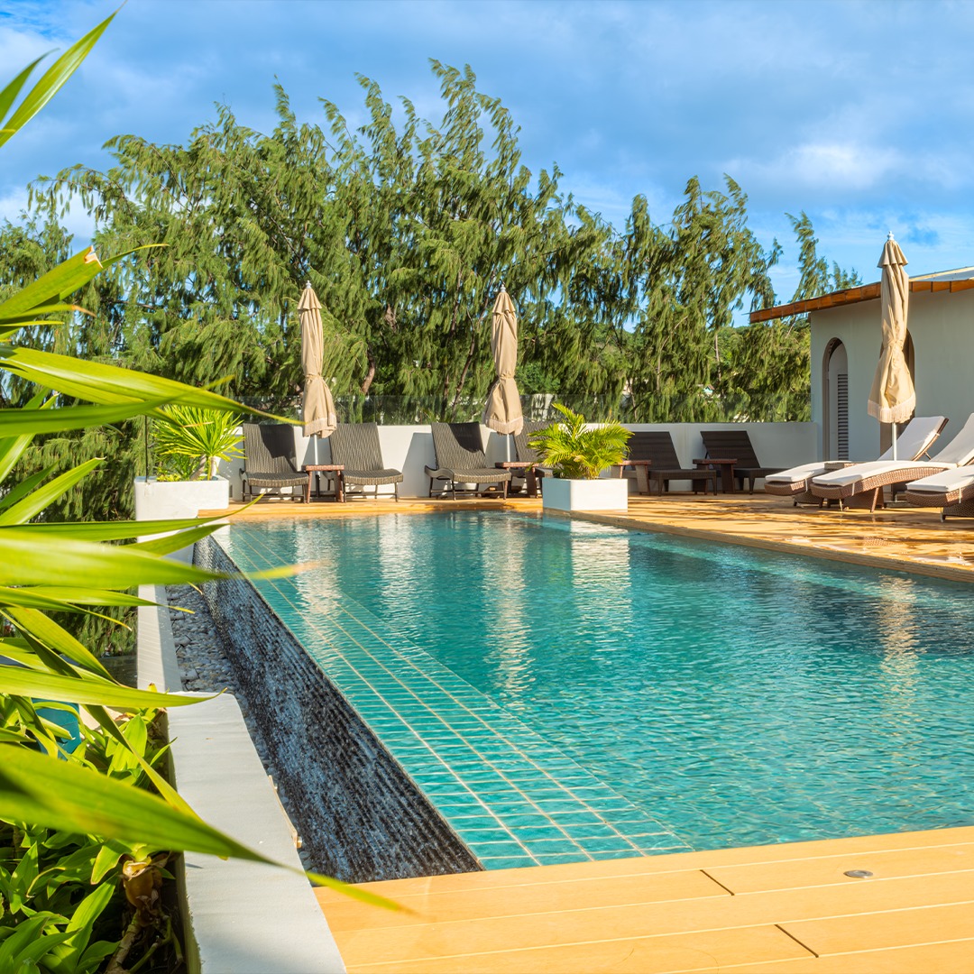 The property features multiple floors with guest rooms and suites, many with balconies or outdoor spaces and modern tropical-inspired design.