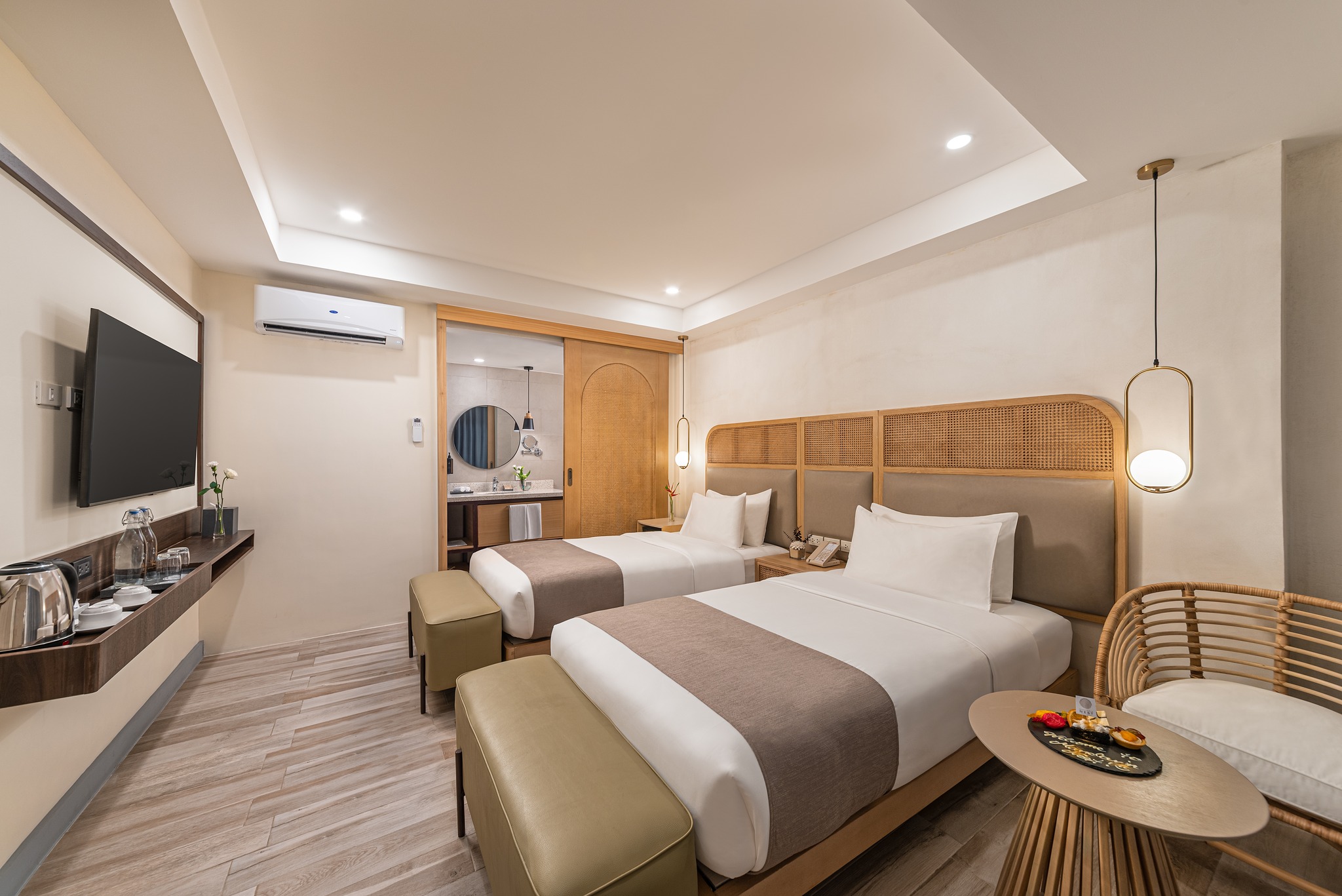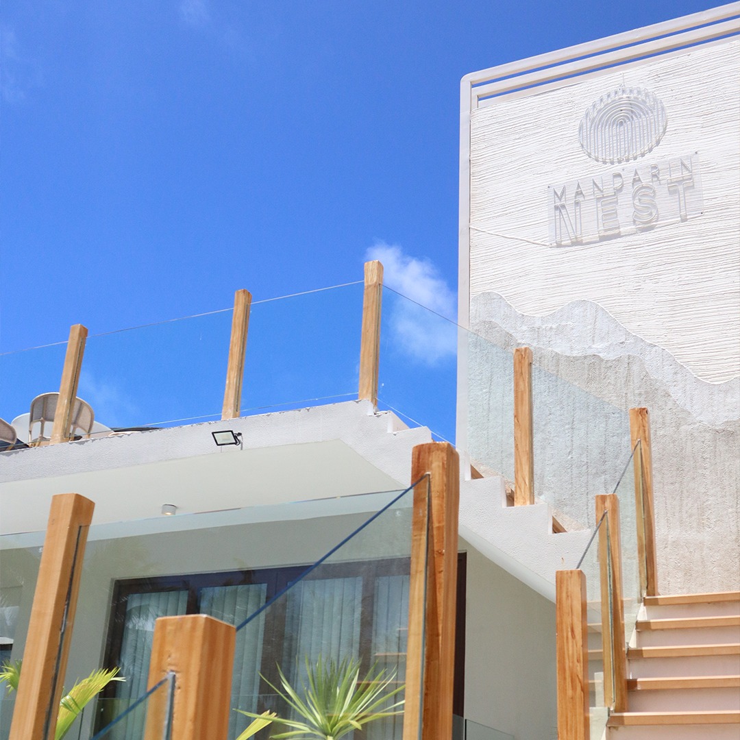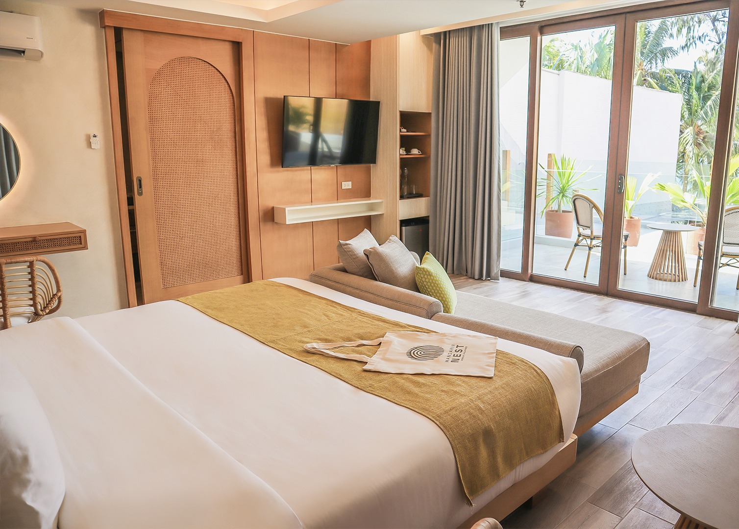 The property features multiple floors with guest rooms and suites, many with balconies or outdoor spaces and modern tropical-inspired design.